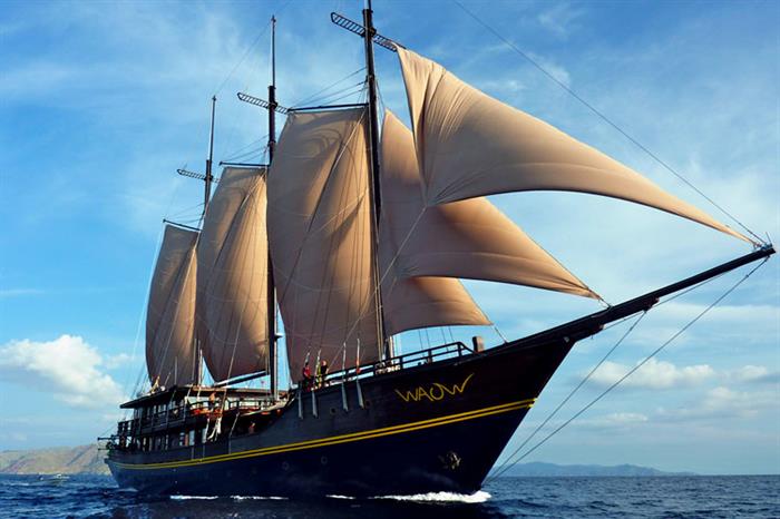The WAOW, so named from peoples’ exclamation upon seeing the vessel plans, was a three-masted sailing vessel. Her name came to mean Water Adventure Ocean Wide and she was constructed entirely from wood, with steel masts. She was built by a team of traditional master carpenters with 400 years of construction history and was created with Ironwood, a particularly rare type of wood. It took four years to build her and her design was inspired by traditional Indonesian cargo boats, the Phinisi, and straight-deck Schooner style vessels.
